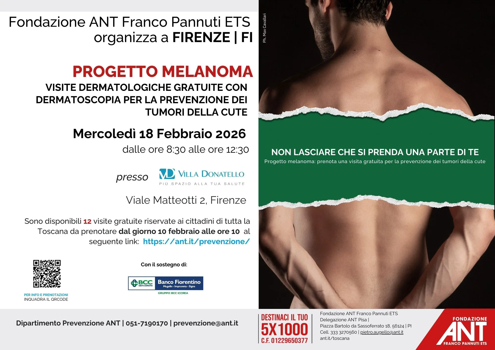 Nell’ambito del Progetto Melanoma, Fondazione ANT Italia ONLUS organizza nella Sede di Villa Donatello (in viale Matteotti 2, a Firenze) 12 controlli gratuiti per la prevenzione dei tumori della cute, in questo caso grazie al sostegno del Banco Fiorentino.