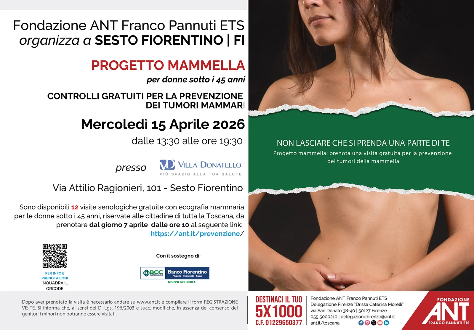Nell’ambito del Progetto Mammella, Fondazione ANT Italia ONLUS organizza nella Sede di Villa Donatello (in via Attilio Ragionieri 101, a Sesto Fiorentino) 12 visite senologiche gratuite con ecografia mammaria, in questo caso grazie al sostegno del Banco Fiorentino.