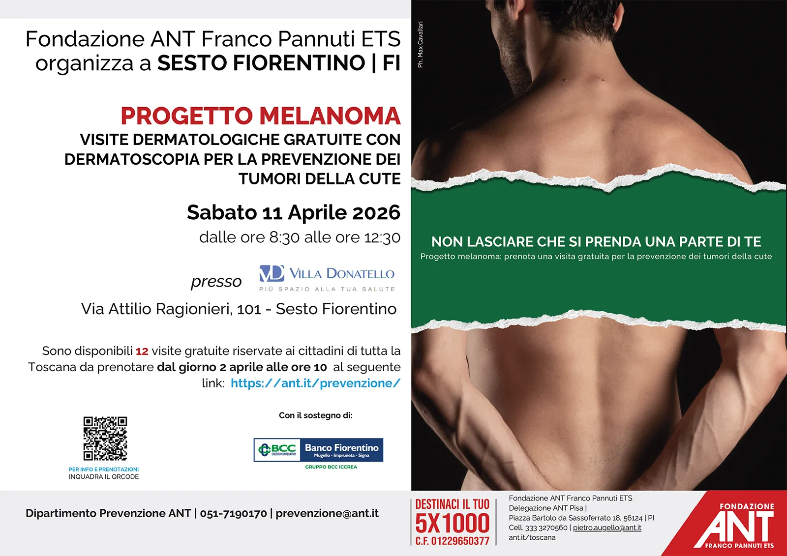 Nell’ambito del Progetto Melanoma, Fondazione ANT Italia ONLUS organizza nella Sede di Villa Donatello (in viale Matteotti 2, a Firenze) 12 controlli gratuiti per la prevenzione dei tumori della cute, in questo caso grazie al sostegno del Banco Fiorentino.